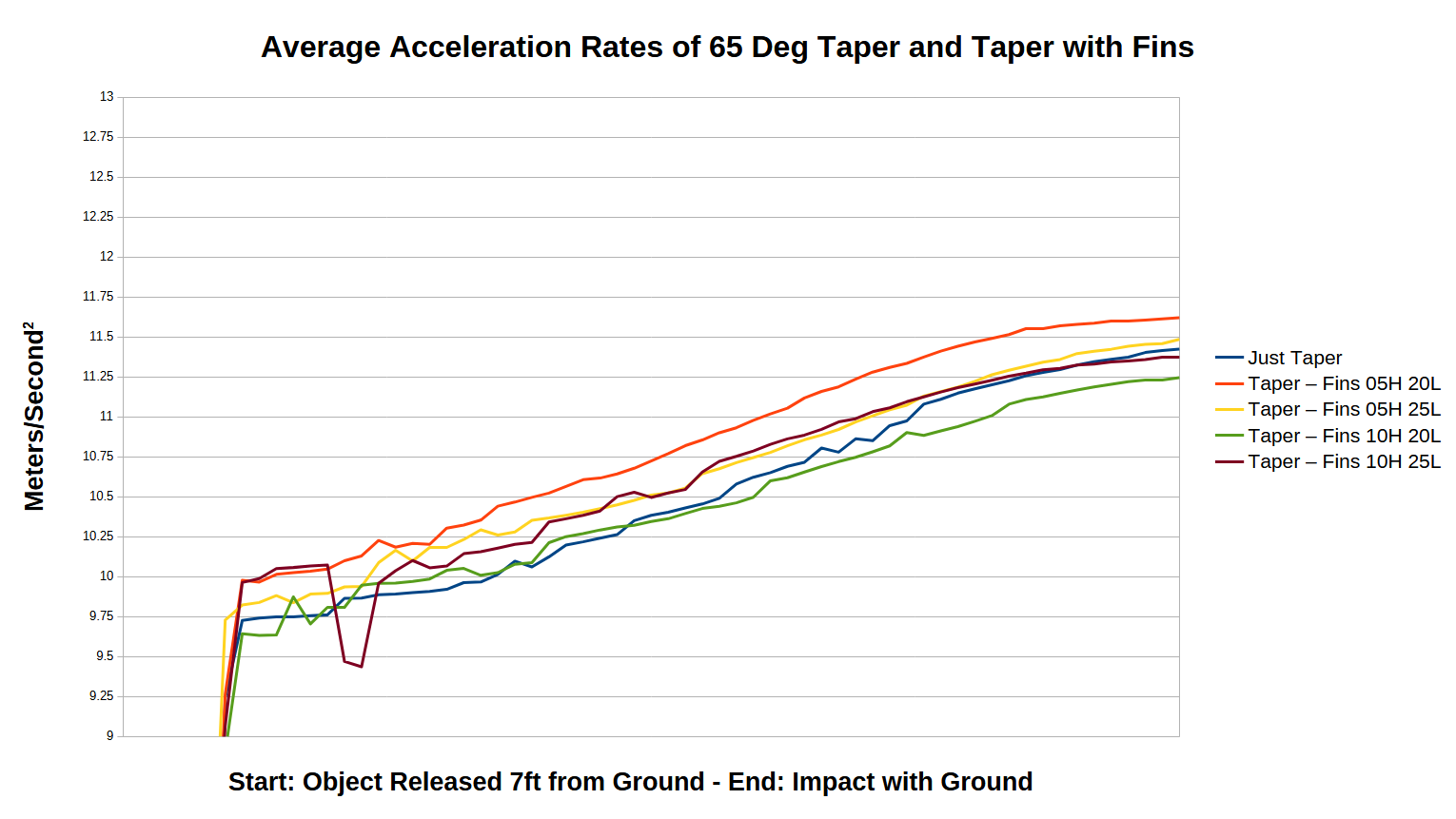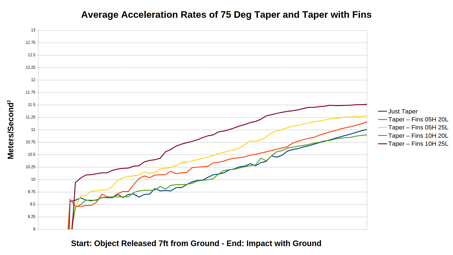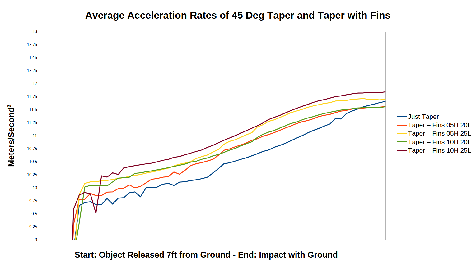 - In the 45 Degree taper variants the model with the largest fin, 10mm Height and 25mm Length, had the highest average acceleration rate of 11.8448 meters/second2.