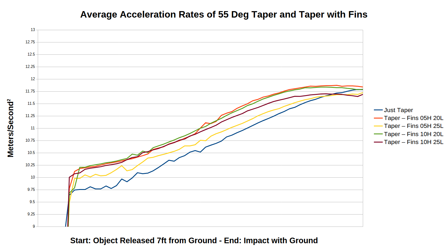 - In the 55 Degree taper variants the model with the smallest fin, 5mm Height and 20mm Length, had the highest average acceleration rate of 11.8395 meters/second2.